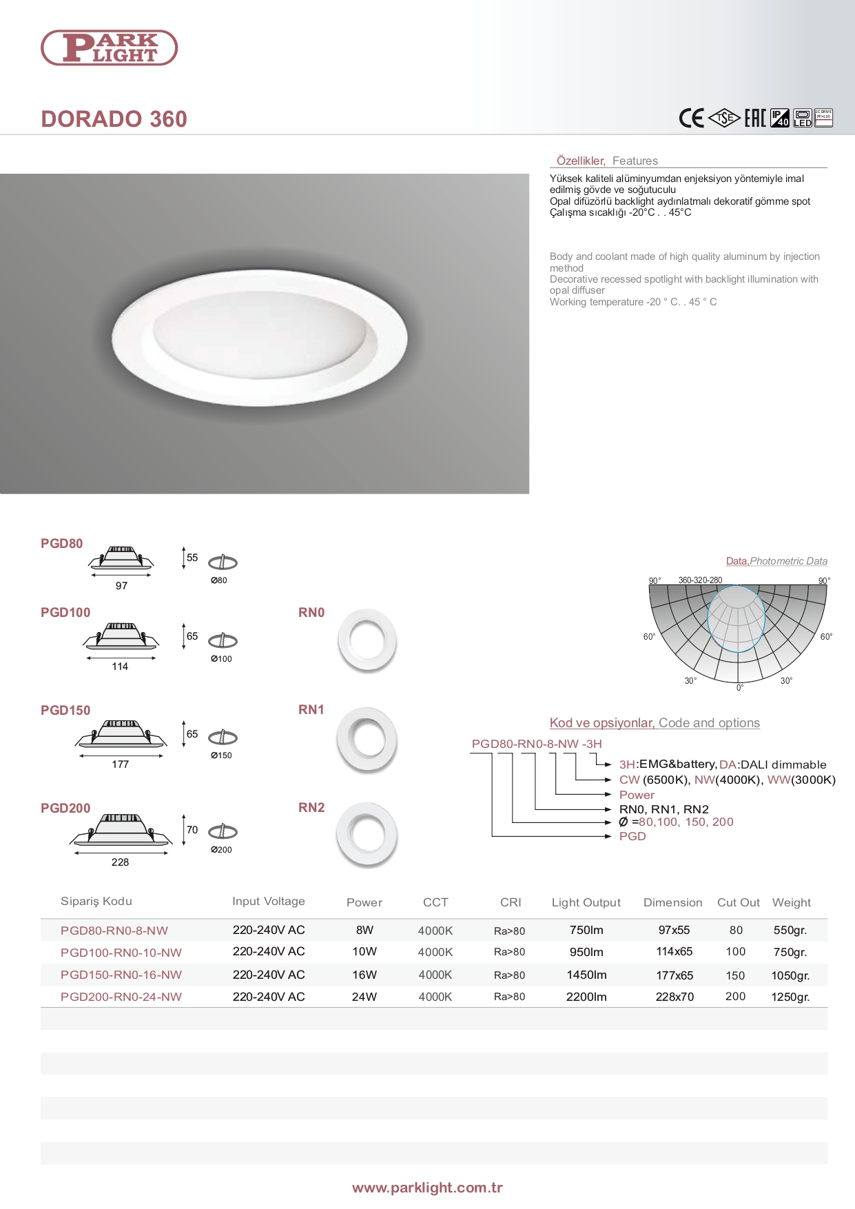 | Ürün Kodu | Giriş Voltajı | Güç | CCT | CRI | Işık Çıkışı | Boyut |